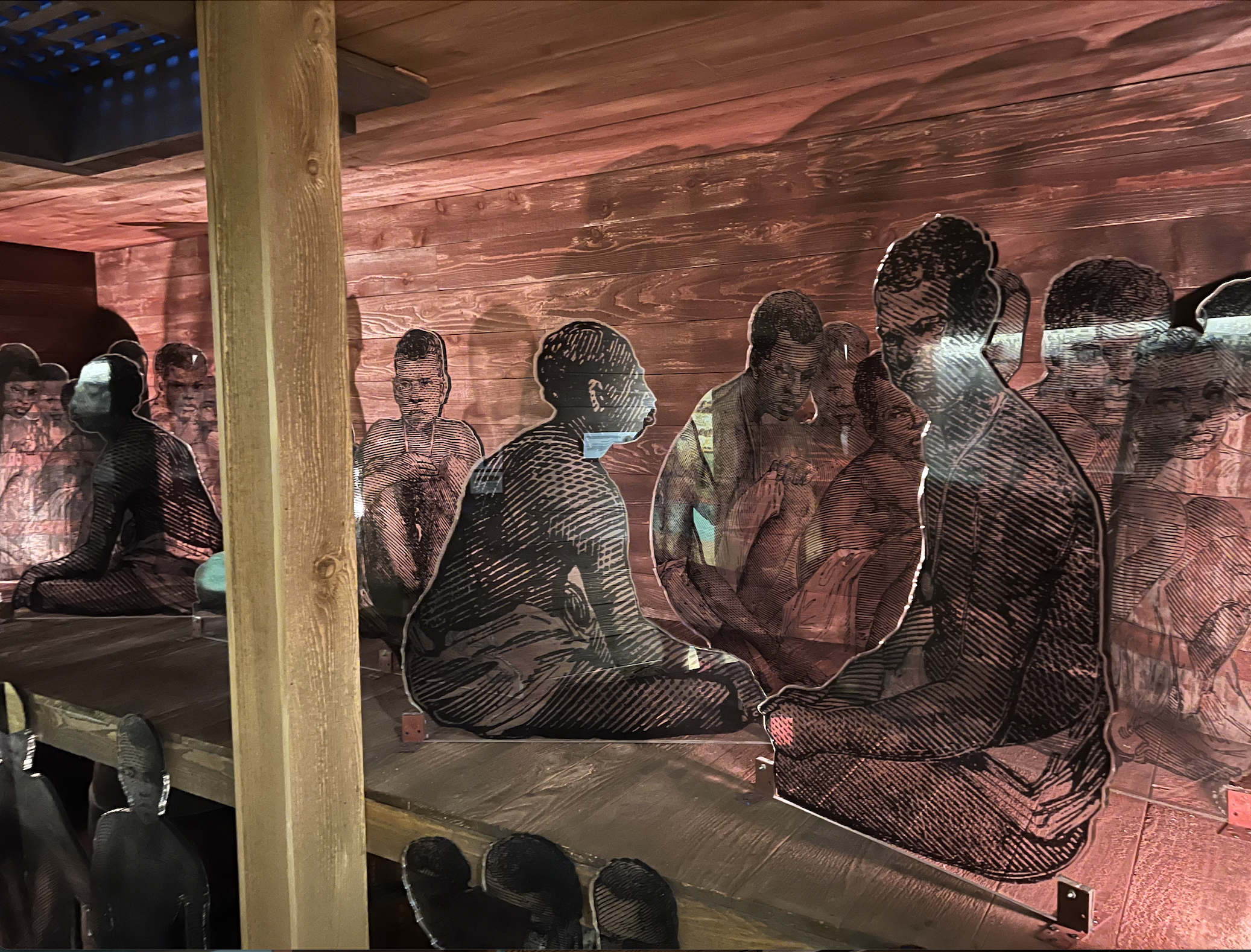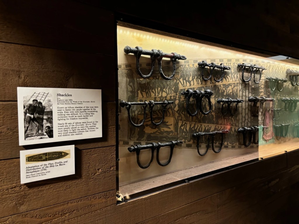 Toward the end of the “Spirits of the Passage” exhibit, a dark and narrow hallway waits for visitors, a symbolic Door of No Return. After reading about the Door of No Return, I moved into the dark passage, meant to simulate a ship’s slave hold, where all my senses were engaged. Below my feet, wooden planks made it feel as if I was aboard the ship and sounds of ocean waves, shouts of the crew, and the clinking of shackles could be heard in the distance through unseen speakers. To my left, shackles of all sizes excavated from the Henrietta Marie were on display, the variety in sizes serving as a physical reminder that even small children were victims of the slave trade. Who made these child-sized shackles, and how were they able to sleep at night knowing what they would be used for? To my right, half decks were crowded with Plexiglas figures of chained Africans. In combination with the narrow passageway, this visual experience evokes discomfort and confinement, a momentary glimpse into the inhumane conditions Africans faced aboard the Henrietta Marie and other slave ships.