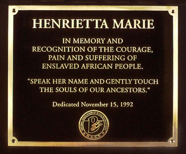 A bronze memorial plaque facing toward Africa was placed at the Henrietta Marie site by the National Association of Black SCUBA Divers (NABS).