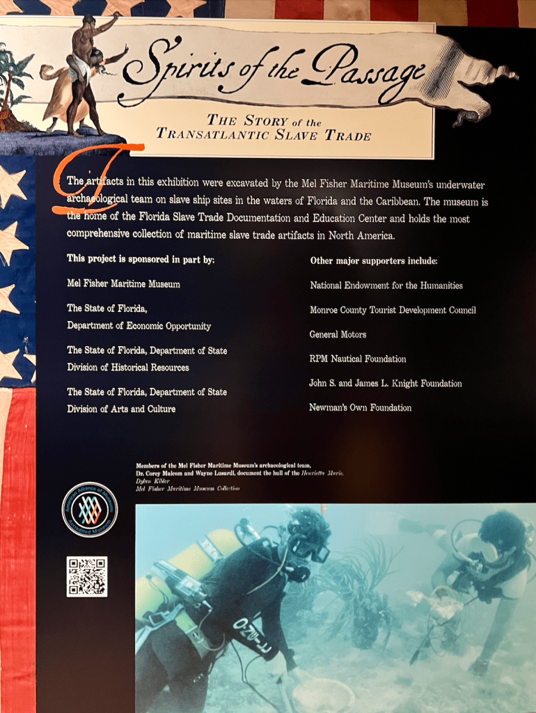 In late 2024, the Mel Fisher Maritime Museum revealed a new, permanent exhibit, “Spirits of the Passage: The Story of the Transatlantic Slave Trade,” which documents the slave trade and Key West’s role in it using a collection of artifacts, models, audio recordings, graphics, and interactive displays.[6] This exhibit not only does the important job of educating visitors on the slave trade, the interactive approach brings life to those aboard the ships, humanizes the enslaved, and cements their role in our collective memory and consciousness.