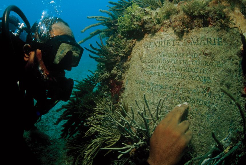 A bronze memorial plaque facing toward Africa was placed at the Henrietta Marie site by the National Association of Black SCUBA Divers (NABS).
